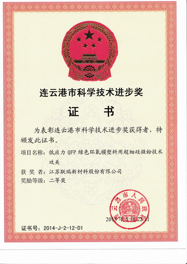 由江蘇聯(lián)瑞新材料股份有限公司承擔實(shí)施的“低應力QFP綠色環(huán)氧模塑料用超細硅微粉技術(shù)攻關(guān)項目”榮獲“連云港市科技進(jìn)步二等獎”。